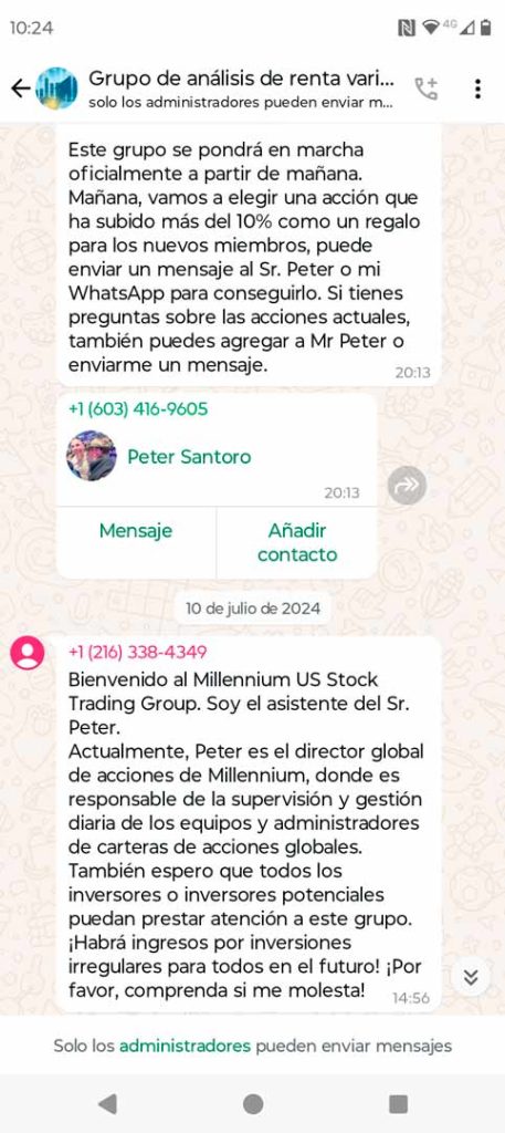 A continuación, os muestro el mensaje de bienvenida de una de las personas que se hacían pasar por asistente del gurú de las inversiones, un tal PETER SANTORO.