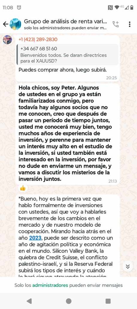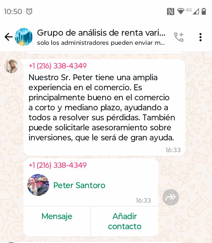 Hasta aquí este artículo de los días posteriores a la entrada en el grupo whatsapp y de como hacen la presentación y la inclusión del gurú PETER SANTORO, todo un espectáculo de información falsa (números de teléfonos) y de mensajes persuasivos. Espero que os sirva para identificar este tipo de fraudes.