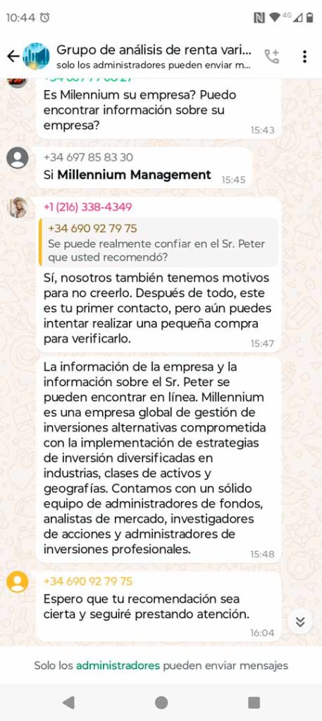 Algunos de los usuarios, que son personas normales que cayeron en el grupo, empezaron a hacer preguntas interesantes sobre si es confiable este grupo y sobre todo el gurú PETER SANTORO. Para generar confianza dicen que PETER, pertenece al Grupo de Gestión Global de Inversiones Millennium Management.