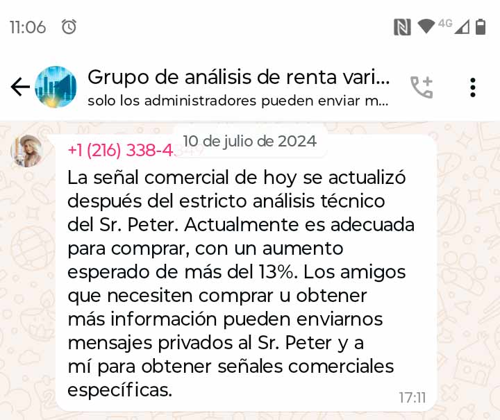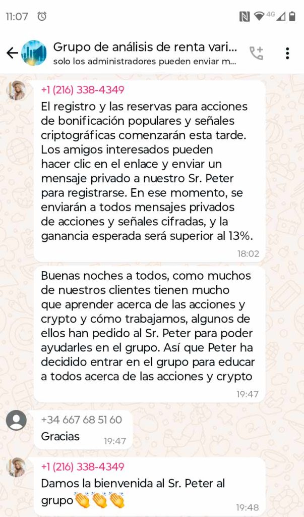 En esta fase los estafadores, hablan de noticias diarias sobre acciones y criptomonedas, hasta aquí todo parece normal. En el grupo de whastapp los otros usuarios que lo componen interactúan y muestran su interés en aprender y leer información referente a las inversiones, al igual que yo.