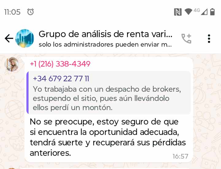 Cuál es mi sorpresa que cuando entra este señor al grupo lo hace con otro número diferente, digamos que es el tercer número que muestran de él, algo fuera de lo común, pero que nadie observó o nadie quiso preguntar el porqué, ya que también sospecho que los otros usuarios del grupo estaban metidos en la estafa, más adelante os contaré por qué pienso esto.