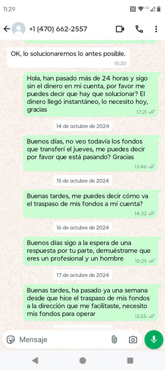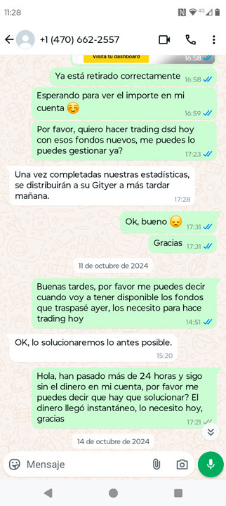 Cuando realicé el traspaso, el dinero nunca apareció en mi cuenta de Gityer. Al intentar reclamar, el servicio de atención al cliente comenzó a darme excusas: primero dijeron que necesitaban «comprobar las estadísticas» y verificar que todo estuviera correcto. Más tarde, alegaron que había un supuesto problema técnico. Con el tiempo, simplemente dejaron de responder y bloquearon mi acceso al chat de WhatsApp que había estado utilizando para comunicarme con ellos.