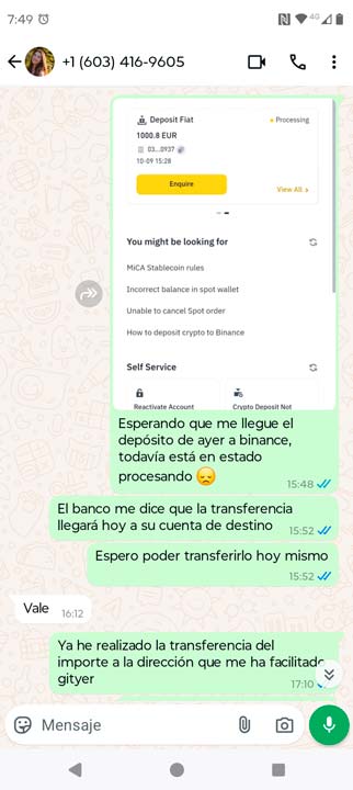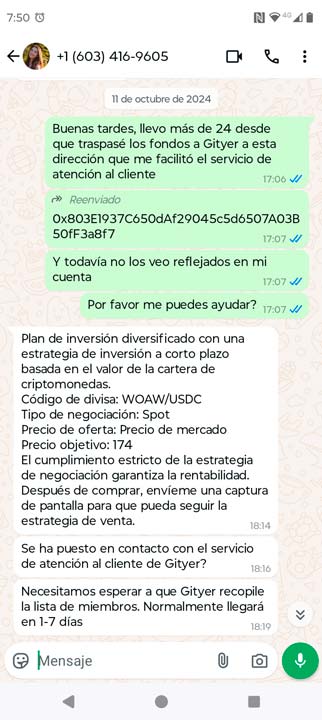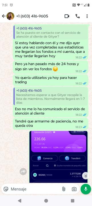 Y también se puede ver claramente la primera mentira que me da la asistente en complot con el servicio de atención al cliente, «necesitamos esperar a que Gityer recopile la lista de miembros. Normalmente llegará en 1-7 días», todo mentira, lo único que hacen es alargar el tiempo para que puedan ejecutar la estafa y después desaparecer y no hablarte más, también bloquearte del whatsapp, esto ya hablaré más a fondo en los siguientes capítulos del pésimo y estafador servicio de atención al cliente que tiene esta plataforma Gityer.