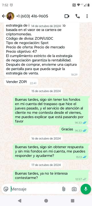 Intenté buscar respuestas en el grupo de WhatsApp de las personas involucradas en estas inversiones. Sin embargo, mi preocupación solo creció cuando nadie respondió a mis mensajes. Las preguntas sobre mi transferencia fueron completamente ignoradas por los administradores y los otros participantes del grupo.