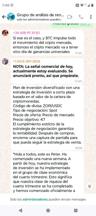 Era la opción más fiable, un grupo compuesto por unas 30 personas, digo yo alguno me contestará y me podrá orientar, algún consejo, recomendación…pues bien, nada de nada, silencio absoluto, nadie me respondió a mi petición de ayuda. Aquí dejo otra captura de pantalla de whastapp, justo después de mi consulta, siguieron hablando de las inversiones como si no hubiera pasado nada.