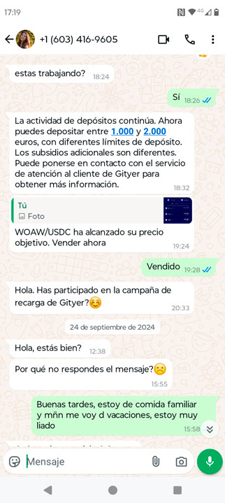 Todo comenzó cuando me topé con una oferta de bienvenida de Gityer: un regalo de 50$ para operar en su plataforma de trading. No requerían ningún depósito inicial, lo que me hizo confiar. Pensé: «Si no tengo que invertir nada, no tengo nada que perder». Con los 50$ de bienvenida, empecé a hacer trading y, sorprendentemente, logré generar ganancias con la información que me daban desde el grupo y el asistente de Peter a nivel privado por whastapp. La plataforma mostraba cómo mi saldo aumentaba y, al poco tiempo, ya tenía una cantidad considerable acumulada. Hasta ese punto, parecía que todo funcionaba como prometían, y comencé a pensar que había encontrado una buena oportunidad.