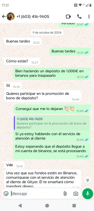 Para darle un toque más de creencia y autenticidad, me facilita directamente el teléfono de atención al cliente de Gityer, que fue el que me ayudó a transferir mis fondos de Binance a Gityer. Aquí lo podéis ver claramente en la imagen del whastapp.