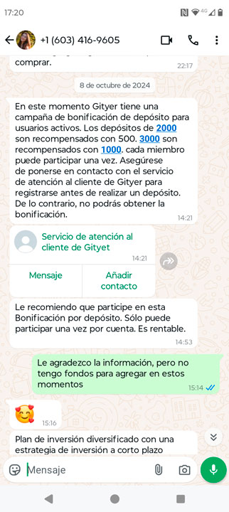Es una presión constante a la que te someten, y siguen a la semana siguiente con el engaño de la actividad de depósito en Gityer, como se puede ver en esta imagen.